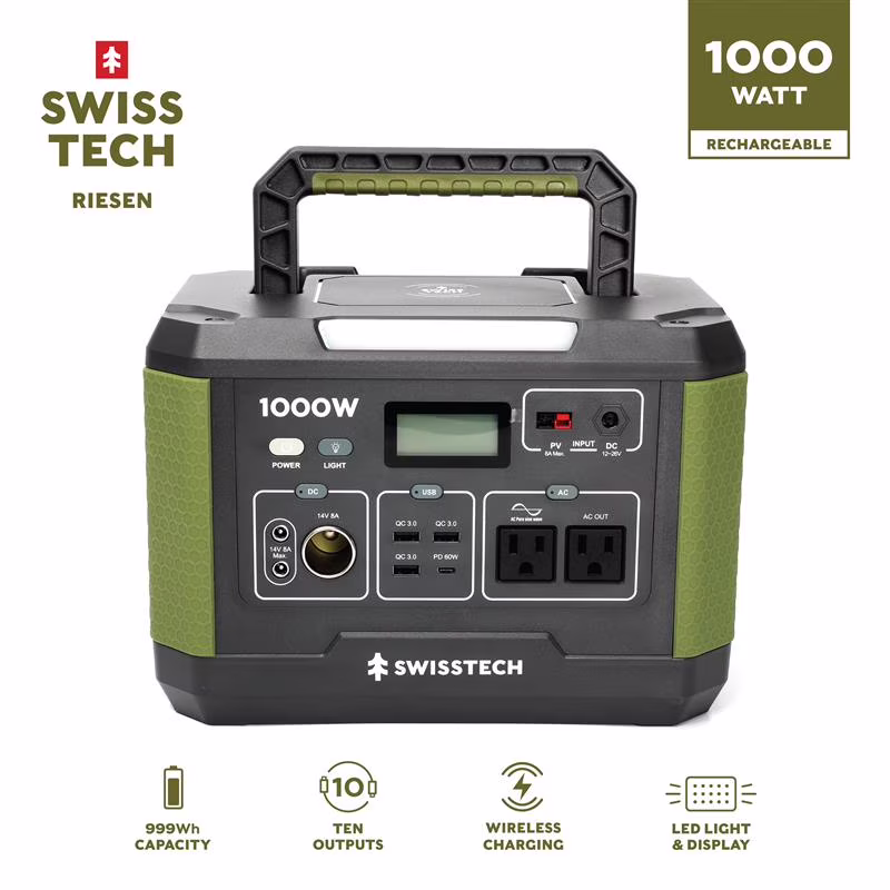 Swiss Tech 1000W portable power station 999Wh solar generator for camping & emergency use